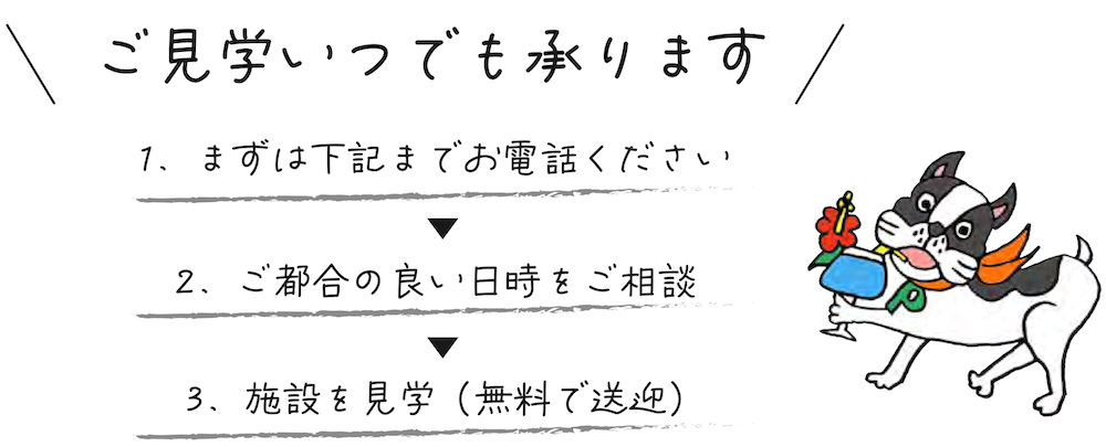 お知らせ ご見学いつでも承ります Tweet 2026.03.20 by 北川 0 まずは下記までお電話ください ご都合の良い日時をご相談 施設を見学(無料で送迎) ☎ 080-5247-9203 土日祝日をのぞく 9:00~17:00 ご利用いただける対象者:要介護・要支援・事業対象者の方